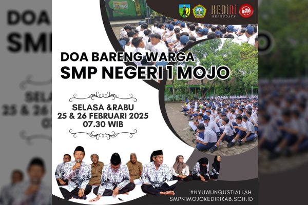 SMP Negeri 1 Mojo menggelar kegiatan doa bersama yang diikuti oleh seluruh warga sekolah, mulai dari siswa, guru, staf, hingga karyawan. Acara yang dilaksanakan pada tanggal 25 dan 26 Februari ini memiliki tujuan, yaitu memohon agar Indonesia senantiasa menjadi negara yang adil, makmur, aman, dan nyaman, terutama dalam bidang pendidikan. Dalam suasana penuh khidmat, doa dipimpin oleh Bapak Didik Arief Mahmudi, S.Ag., yang dengan penuh ketulusan mengajak seluruh peserta untuk bersama-sama melantunkan doa bagi kemajuan bangsa. Kegiatan ini bertujuan untuk memohon perlindungan dan kesejahteraan bagi negara tercinta, serta agar dunia pendidikan Indonesia terus berkembang dengan baik, bebas dari segala bentuk gangguan yang dapat menghambat kemajuan serta persatuan bangsa.